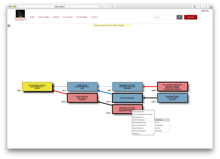 Screen Shot 2016-01-06 at 3.00.09 PM Published on January 6, 2016 in Welcome to TruthSiftFull resolution (1690 × 1223) ← Previous Next → Example 2 after Challenges. The right click on statement menu is shown open on ele41 in position to add a challenge. The Topic Statement is NOT TE.